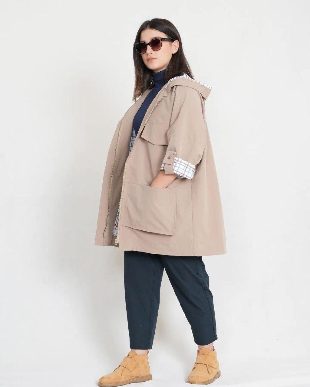 بارانی زنانه مدل الهه دارای جنس کتان تی سی ضد آب آستردار در رنگبندی و فری سایز مناسب 38 تا 46 قابل سفارش است