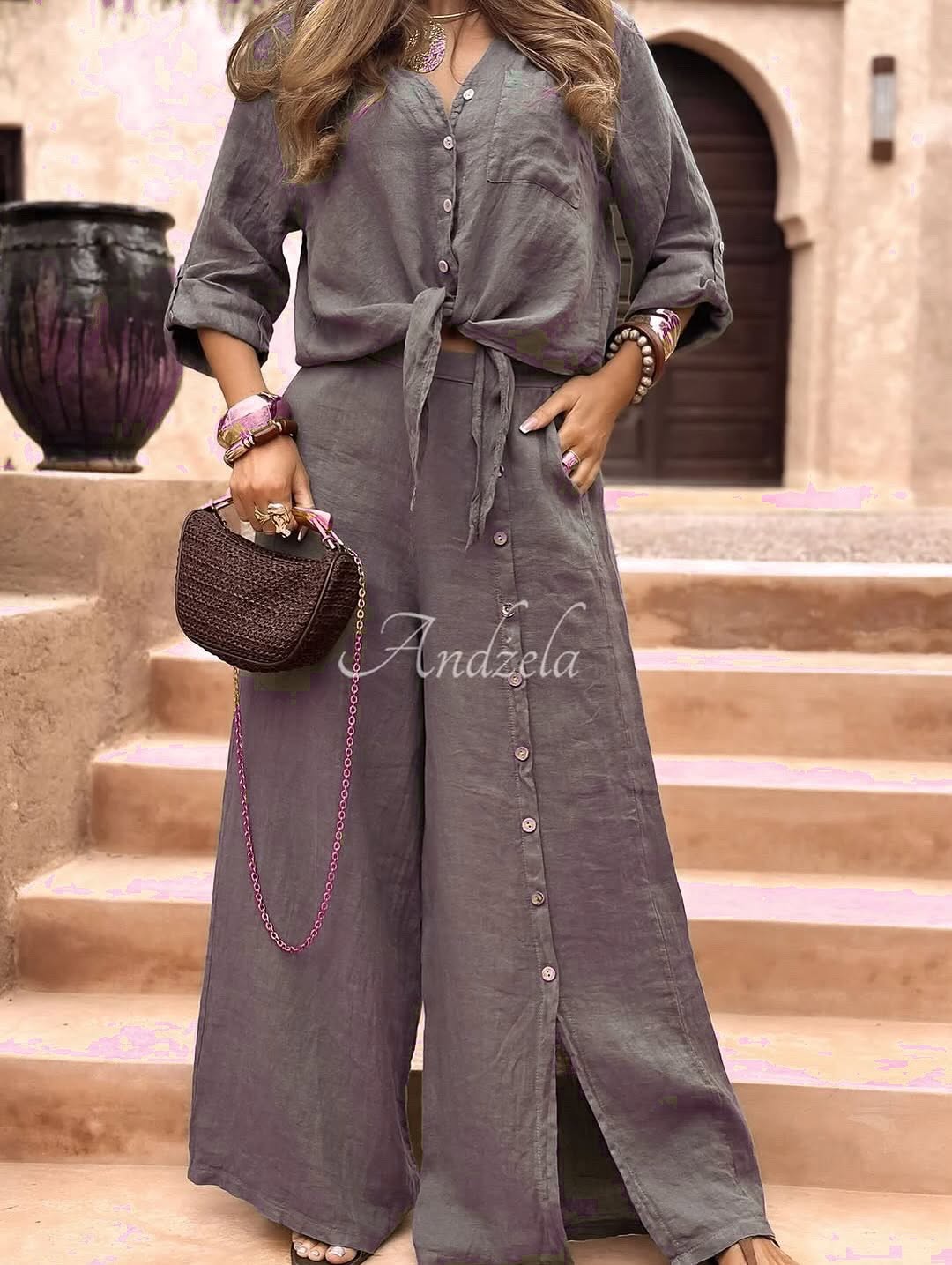 شومیزشلوار زنانه مدل ساناز دارای جنس  لینن صوفیا در رنگبندی و سایزبندی قد شومیز حدود 65 و قد شلوار حدود 106 قابل سفارش است