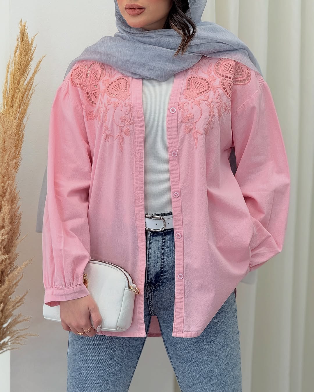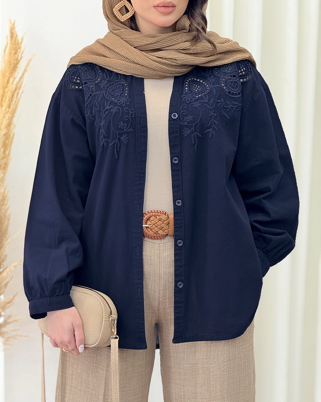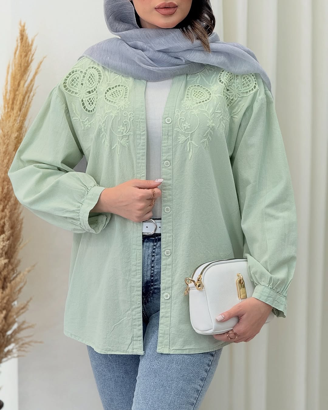 شومیز زنانه مدل فاطیما دارای جنس لینن آنزیم شده با گلدوزی در رنگبندی و فری سایز ( دور سینه حدودا 106 ) قابل سفارش است . قد کار از جلوحدودا 66 قد کار از پشت حدودا 70 میباشد.