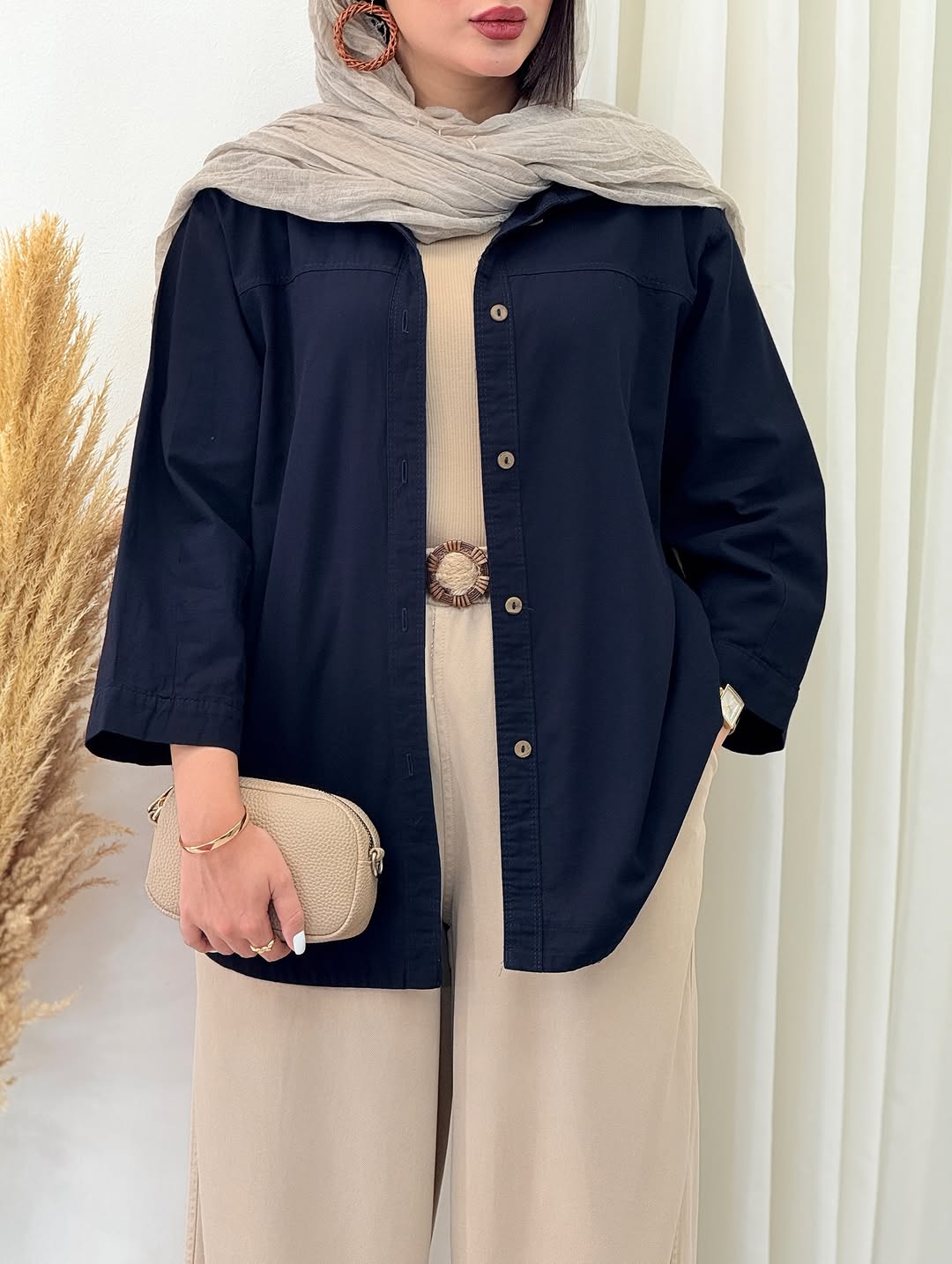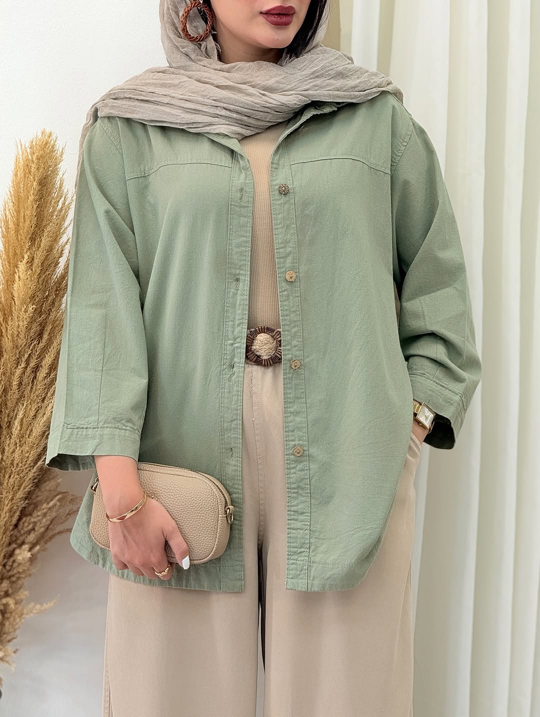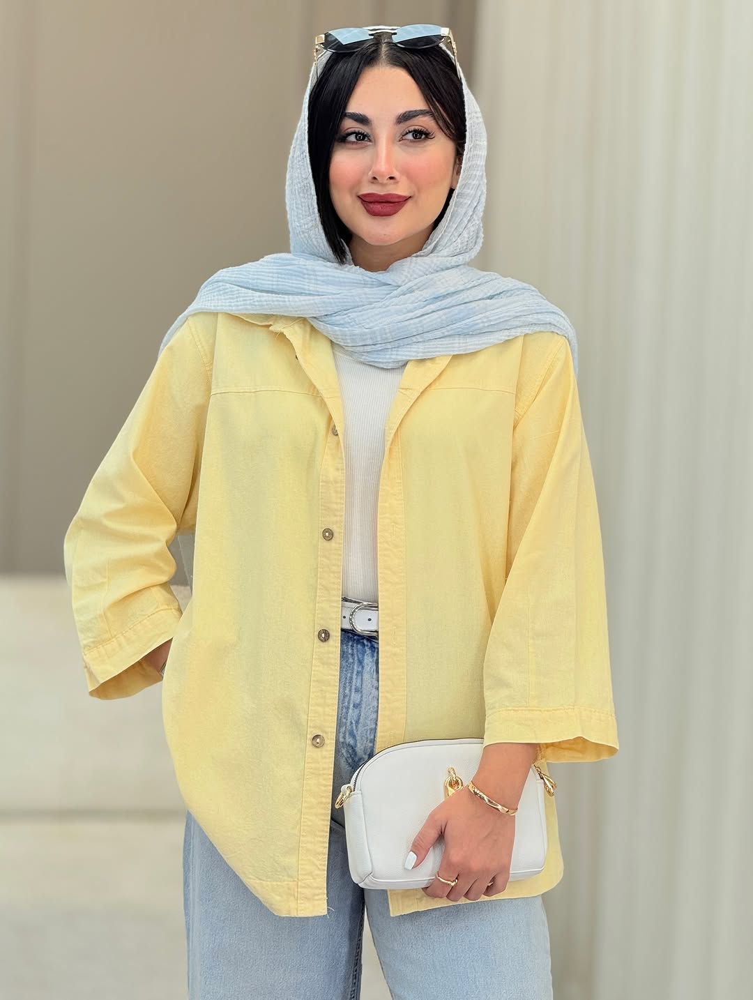 شومیز زنانه مدبل نجما دارای جنس لینن در رنگبندی و سایزبندی با قد حدود 63 قابل سفارش است