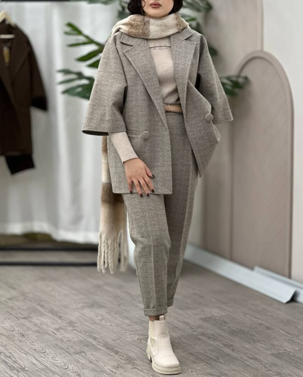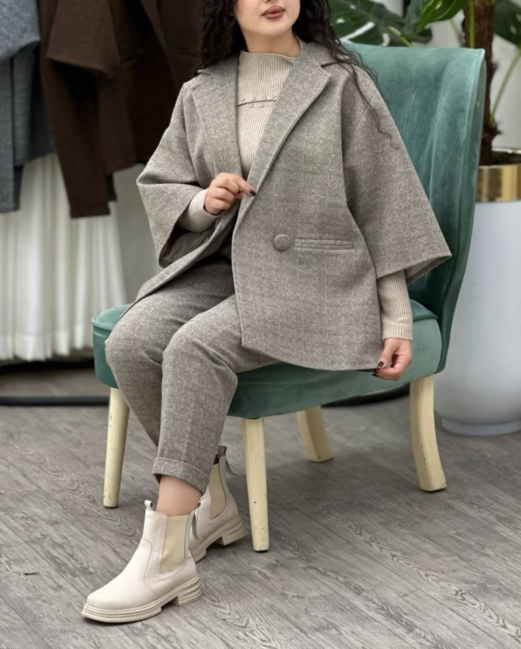 پالتو شلوار زنانه مدل حوا دارای جنس بوتر در رنگبندی و سایزبندی قابل سفارش است قد شلوار حدود ۹۰ و قد پالتو حدود 75