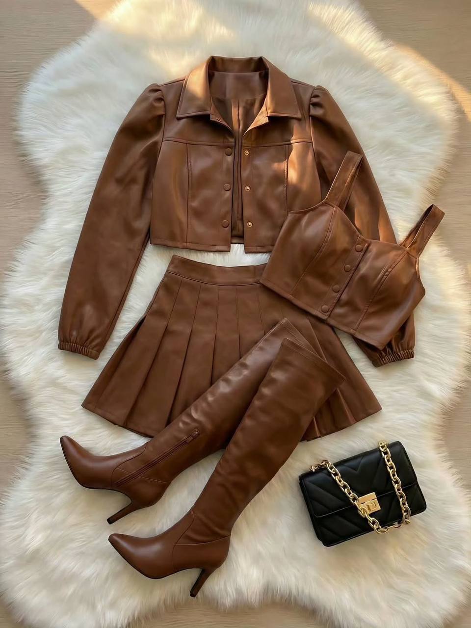 کت دامن و کراپ زنانه مدل ویدا دارای جنس چرم در رنگبندی و سایزبندی قابل سفارش است قد دامن حدود 45 و قد کت حدود 45