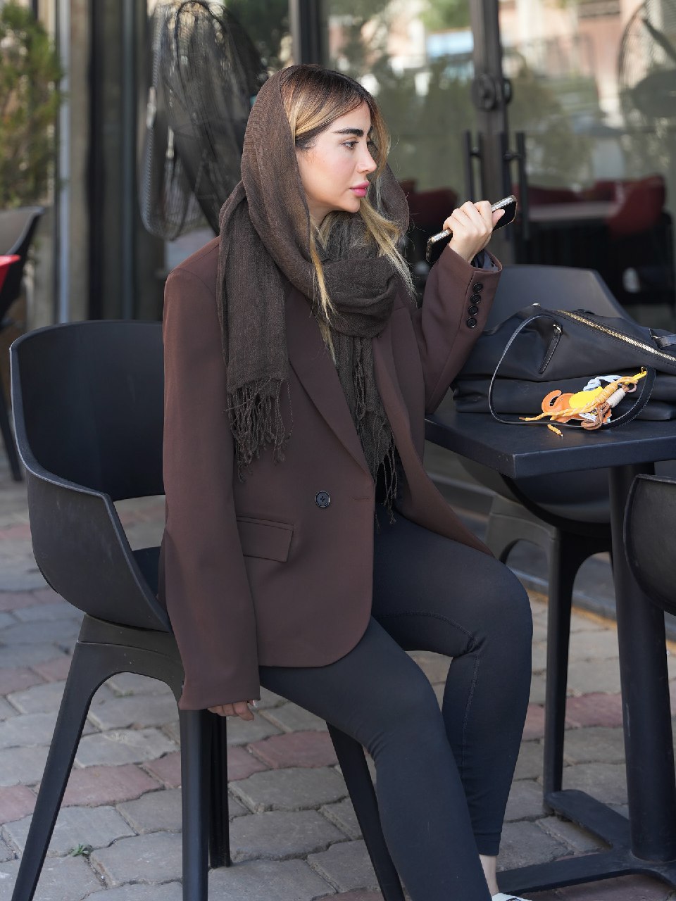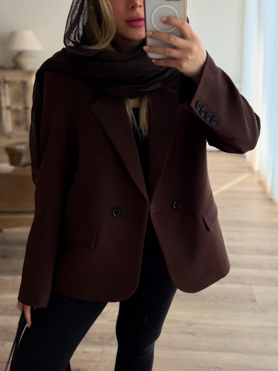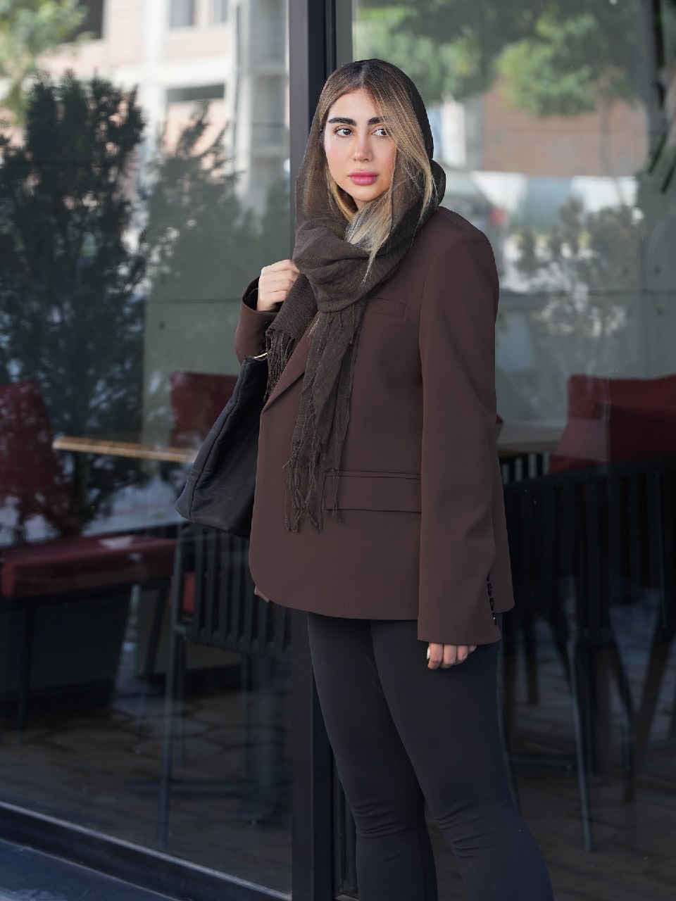 کت زنانه مدل دایانا دارای جنس مازراتی تک رنگ و در سایزبندی با قد حدود ۶۷ قابل سفارش است
