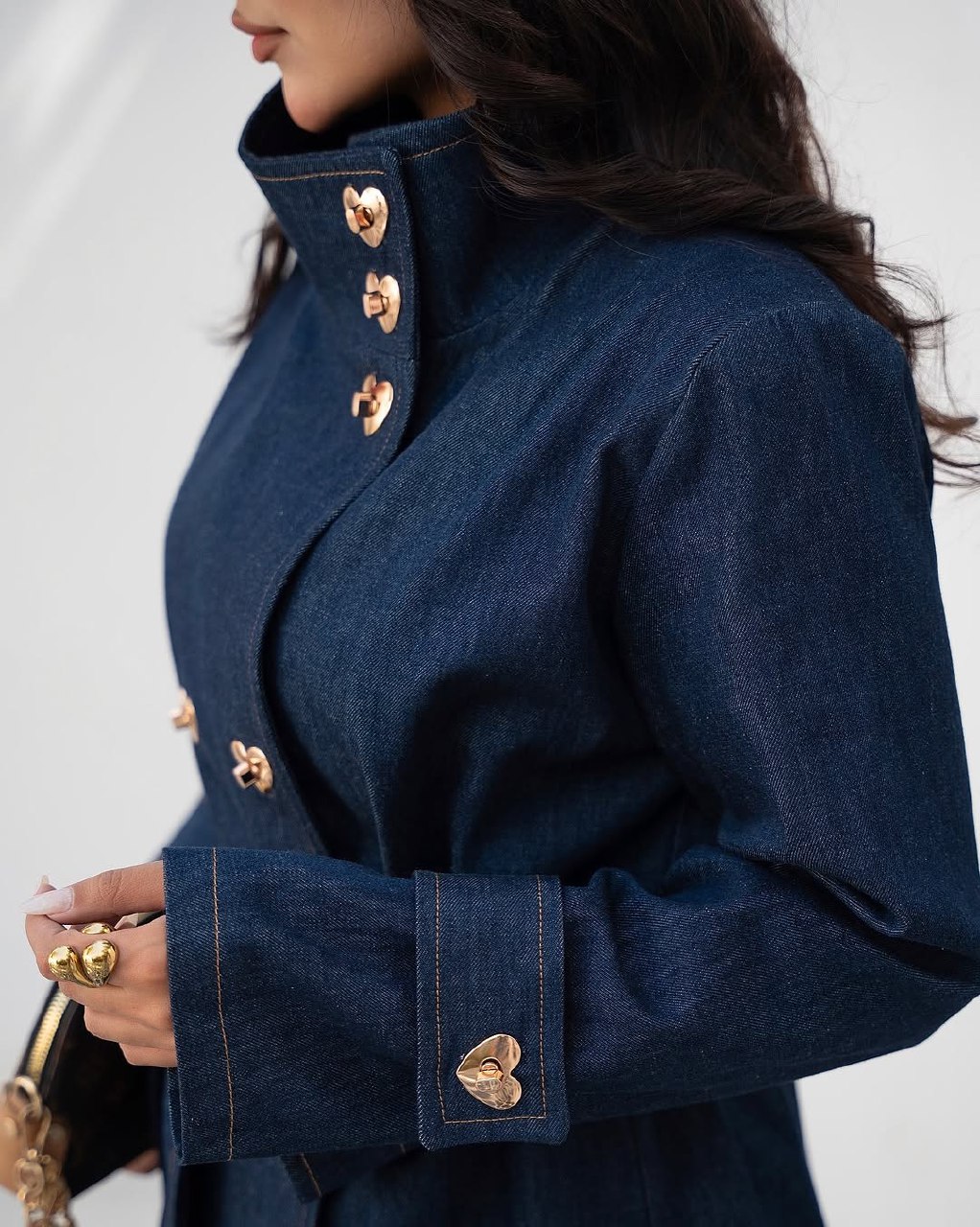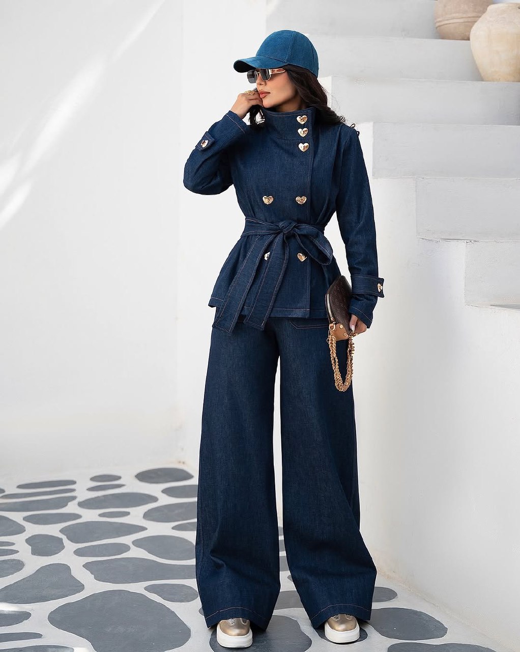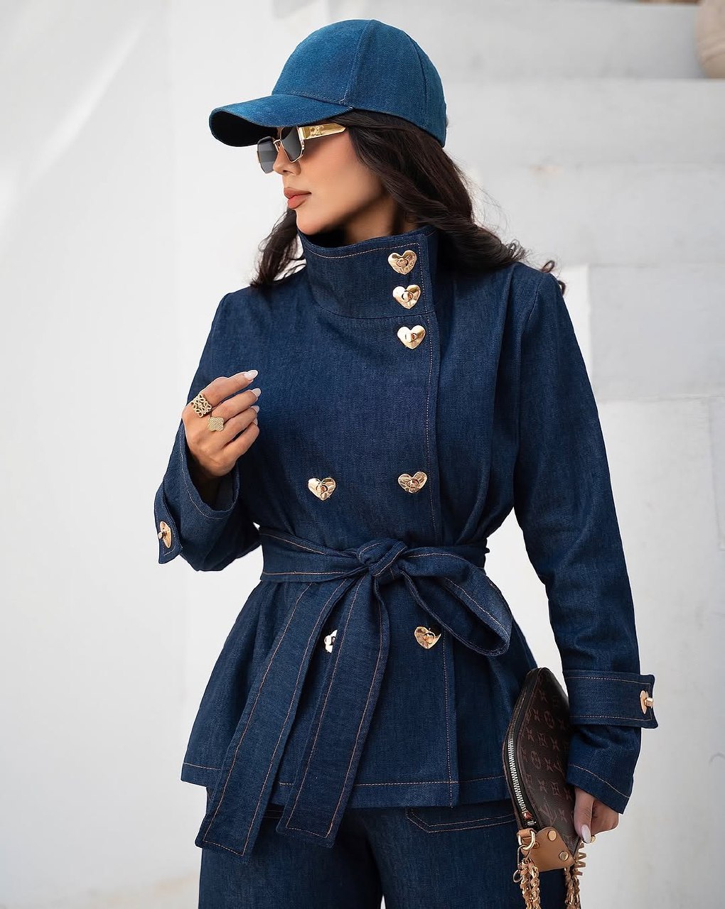 کت شلوار زنانه مدل لاو دارای جنس جین شست شده تک رنگ و در سایزبندی قابل سفارش است قد شلوار حدود ۱۰۶ و قد کت حدود ۶۵