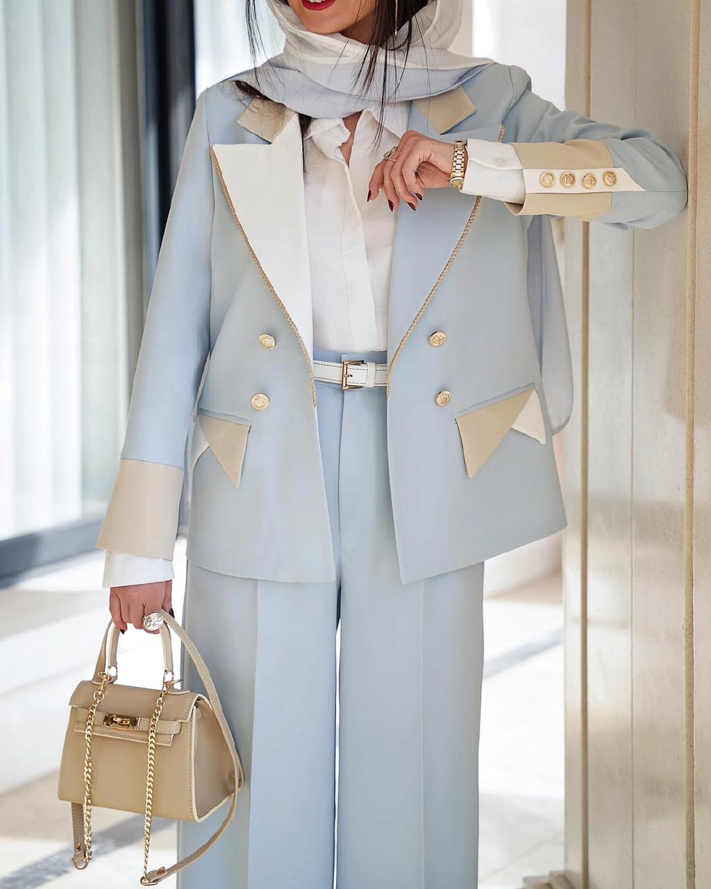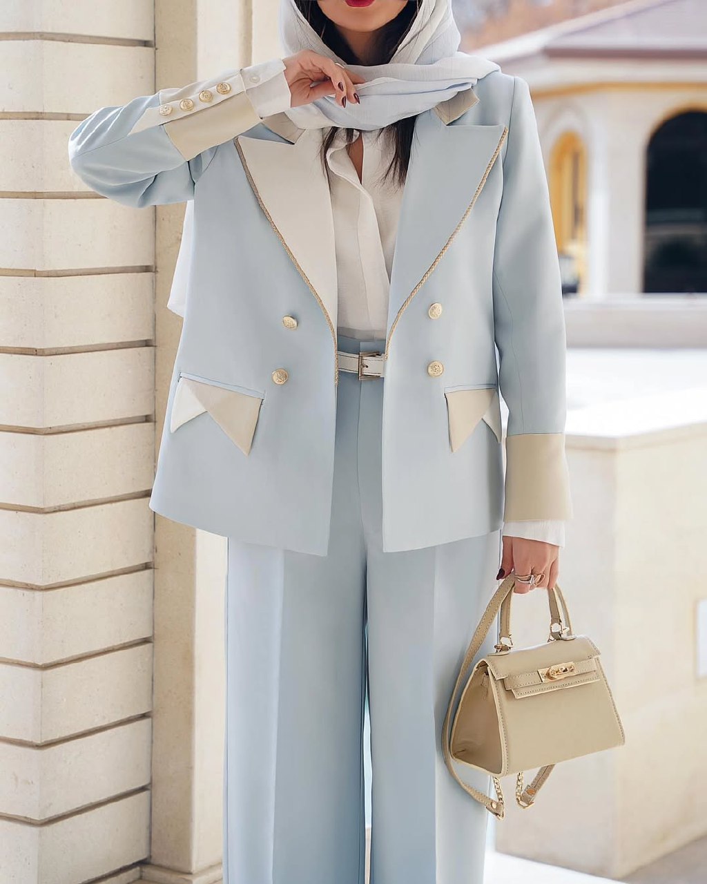 کت و شلوار زنانه مدل آنشلی دارای جنس مازراتی در سایزبندی و تک رنگ قابل سفارش است.قد کت حدودا ۷۰ و قد شلوار حدودا ۱۰۵ میباشد.جلوی کار برای ایستایی بهتر لایی کار شده.